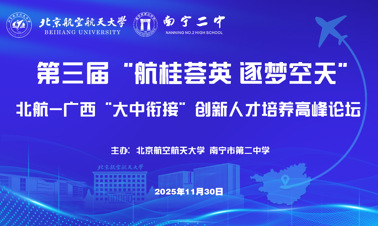 航桂携手育英才 大中衔接启新程——第三届北航-广西创新人才培养高峰论坛举办为大力加强北航与广西壮族自治区重点生源高中的资源共建共享、教育衔接,着力培育优秀拔尖创新人才,11月30日上午,第三届“航桂荟英,逐梦空天”北航-广西“大中衔接”创新人才培养高峰论坛在广西南宁二中凤岭校区召开。广西壮族自治区招生考试院副经理马翀,南宁二中、南宁三中、柳州高级中学、柳州铁一中学、防城港市北部湾高级中学、桂平市浔州高...